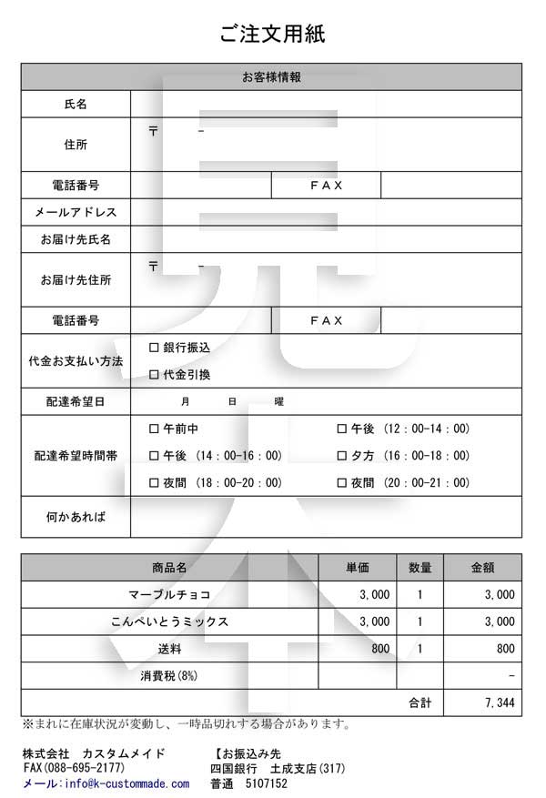 ②ファイルや印刷した用紙にお手持ちのソフトor手書きにて、お客様の情報、商品名やお支払い方法をご記入いただきましたら、
